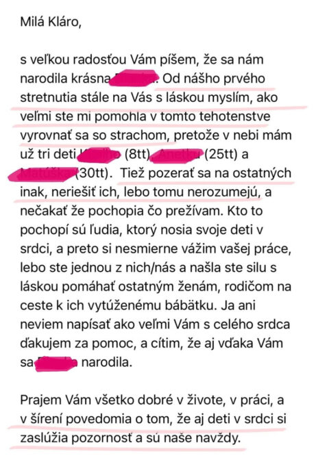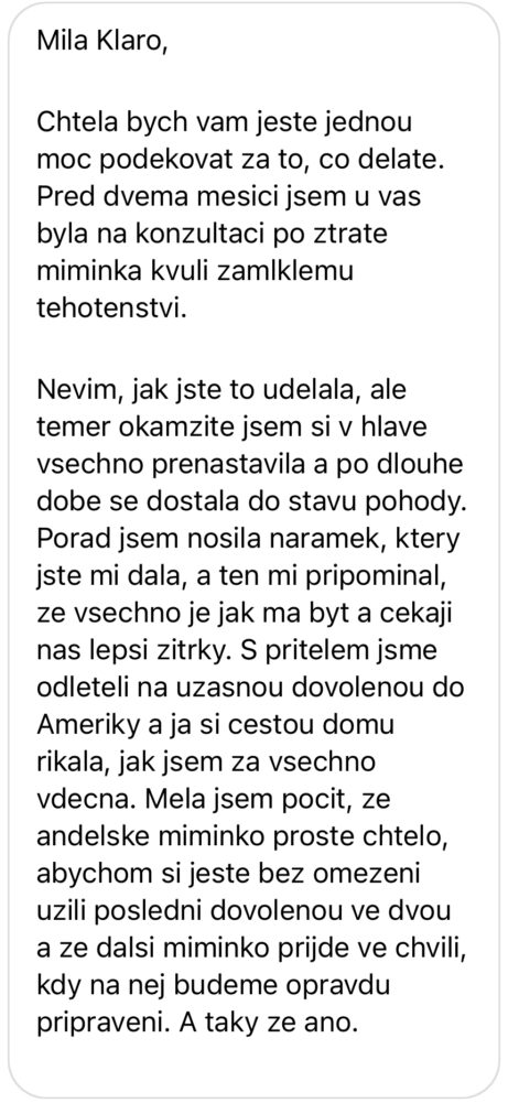 Klárko, děkuji mockrát za dnešní sezení. Ani nejde říct, jak moc se mi díky němu ulevilo. Spoustu mi toho dalo (tipů, jak dál, na co se zaměřit, nastavit si dílčí cíle na cestě za miminkem), utřídilo mi myšlenky, a myslím, že už přichází i maličká naděje, že bych to skutečně mohla všechno zvládnout. Budu na sobě pracovat, aby tu se mnou zůstala a dál rostla. Opravdu mi pomohlo se svěřit někomu, kdo si ztrátou prošel také, ten pocit porozumění je téměř nepopsatelný. Moc a moc Vám z celého ❤️ děkuji.