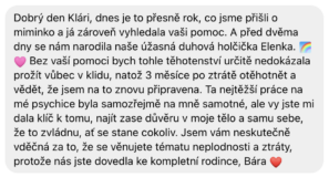 Dobrý den Klári, dnes je to přesně rok, co jsme přišli o miminko a já zároveň vyhledala vaši pomoc. A před dvěma dny se nám narodila naše úžasná duhová holčička Elenka. 🌈🩷 Bez vaší pomoci bych tohle těhotenství určitě nedokázala prožít vůbec v klidu, natož 3 měsíce po ztrátě otěhotnět a vědět, že jsem na to znovu připravena. Ta nejtěžší práce na mé psychice byla samozřejmě na mně samotné, ale vy jste mi dala klíč k tomu, najít zase důvěru v moje tělo a samu sebe, že to zvládnu, ať se stane cokoliv. Jsem vám neskutečně vděčná za to, že se věnujete tématu neplodnosti a ztráty, protože nás jste dovedla ke kompletní rodince ❤️