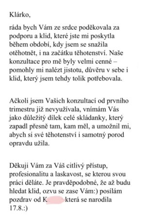 Klárko, chtěla jsem se s vámi podělit o kousek štěstí 🙂 Minulou neděli se nám narodila naše vytoužená holčička. Pořád tomu chvílemi nemůžu uvěřit 🙂 Pocity jsou tak intenzivní... musím říct, že jsem si moc přála zlomit trauma z porodu, které si prožila moje maminka a babička a jsem ráda, že se mi podařilo. Bolest stranou, byl to velmi intimní a krásný zážitek. Rodila jsem zcela fyziologicky bez zásahu. Po příjezdu do porodnice asi za 2,5 h. Měla jsem možnost být v porodním pokoji, který se mi líbil, kde byla i vana, měla jsem domluvenou skvělou PA.... Celkově mi přišlo až osudové, tolik zvláštních náhod kolem. Vše do sebe krásně zapadlo. Ještě jednou děkuji za naše sezení, která mi pomohla zklidnit hlavu a myšlenky. Často si na vás vzpomenu... Ještě jednou děkuji za práci, kterou pro nás, maminky po ztrátě, děláte.