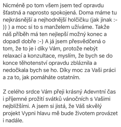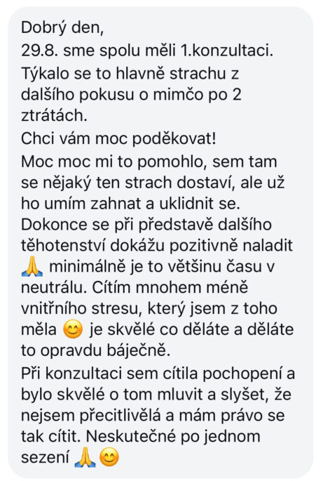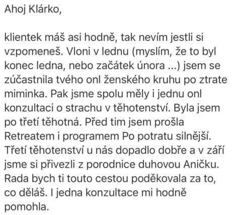 Klárko, chtěla jsem se s vámi podělit o kousek štěstí 🙂 Minulou neděli se nám narodila naše vytoužená holčička. Pořád tomu chvílemi nemůžu uvěřit 🙂 Pocity jsou tak intenzivní... musím říct, že jsem si moc přála zlomit trauma z porodu, které si prožila moje maminka a babička a jsem ráda, že se mi podařilo. Bolest stranou, byl to velmi intimní a krásný zážitek. Rodila jsem zcela fyziologicky bez zásahu. Po příjezdu do porodnice asi za 2,5 h. Měla jsem možnost být v porodním pokoji, který se mi líbil, kde byla i vana, měla jsem domluvenou skvělou PA.... Celkově mi přišlo až osudové, tolik zvláštních náhod kolem. Vše do sebe krásně zapadlo. Ještě jednou děkuji za naše sezení, která mi pomohla zklidnit hlavu a myšlenky. Často si na vás vzpomenu... Ještě jednou děkuji za práci, kterou pro nás, maminky po ztrátě, děláte.