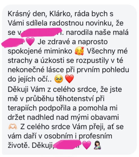 Krásný den, Klárko, ráda bych s Vámi sdílela radostnou novinku, že se v nám narodila naše malá Julia 🩷 Je zdravé a naprosto spokojené miminko 🥰 Všechny mé strachy a úzkosti se rozpustily v té nekonečné lásce při prvním pohledu do jejích očí.. 🥹❤️ Děkuji Vám z celého srdce, že jste mě v průběhu těhotenství při terapiích podpořila a pomohla mi držet nadhled nad mými obavami 🫶🏻 Z celého srdce Vám přeji, ať se vám daří v osobním i profesním životě.