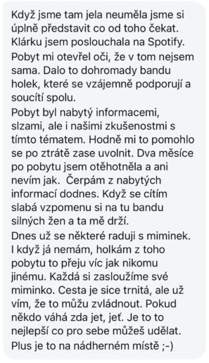 Uvědomuji si, že po rezervaci mohou některé účastnice otěhotnět. Program je proto sestaven tak, aby byl podpůrný a užitečný také v období těhotenství, kdy se po dlouhém čekání či přechozích ztrátách rojí mnoho černých scénářů, zatěžujících myšlenek, pozorování, nervozity... Ty pak způsobují chronický stres zatěžující ženu i miminko.